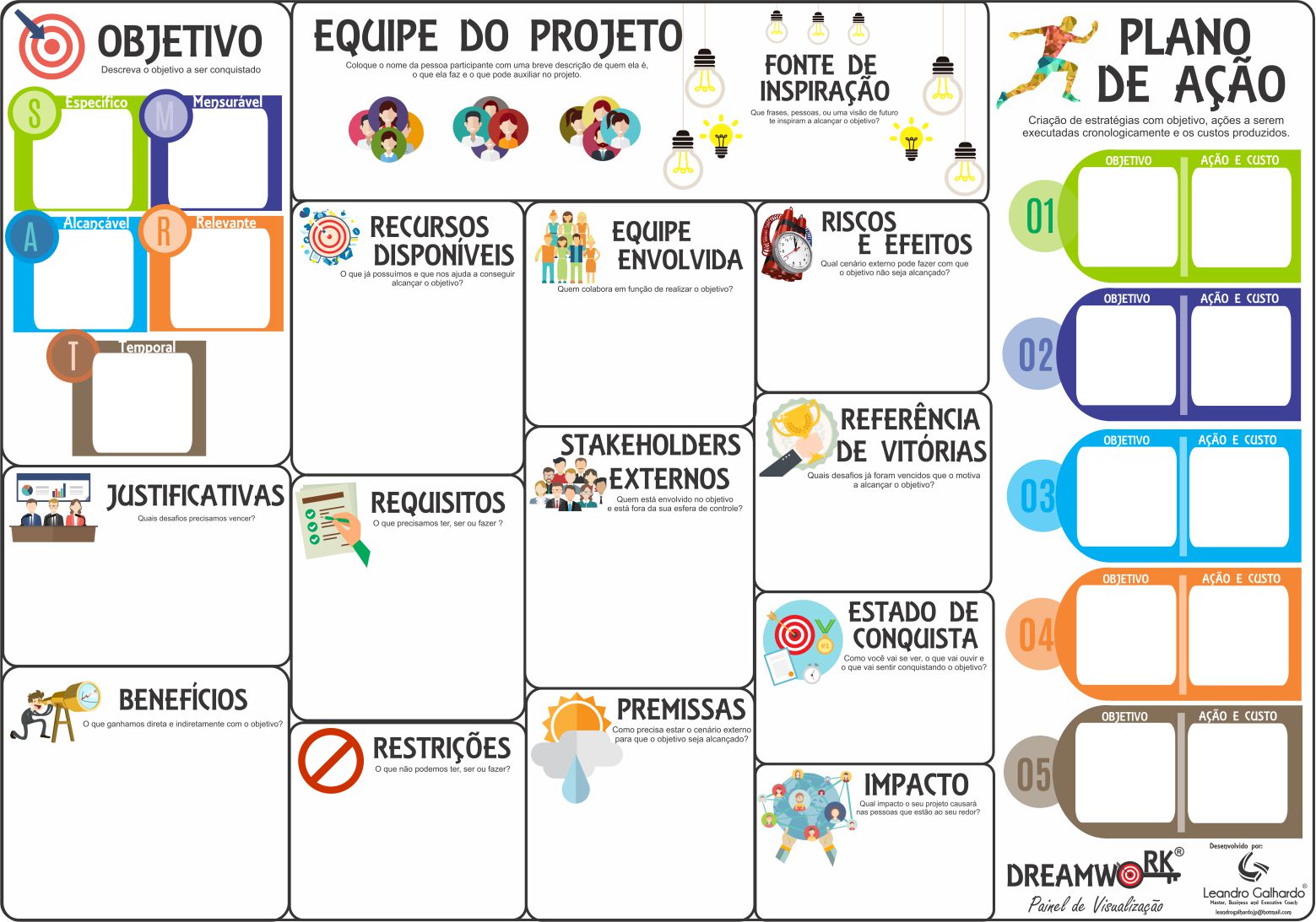 O Dreamwork – Painel de Visualização é uma poderosa ferramenta que te auxilia na estruturação do seu objetivo, seja ele pessoal ou profissional. Baseado no método Canvas, ele permite que você contemple mais afundo o seu alvo através de uma visualização estratégica. O Dreamwork trata-se de um mapa visual, que aborda os principais aspectos que você precisa considerar ao idealizar um objetivo, ele contém os pontos chaves de um bom planejamento que desencadeia num plano de ação bem estruturado.